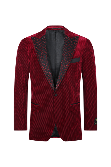 - Bold crimson red velvet blazer with a textured fabric that exudes sophistication and luxury